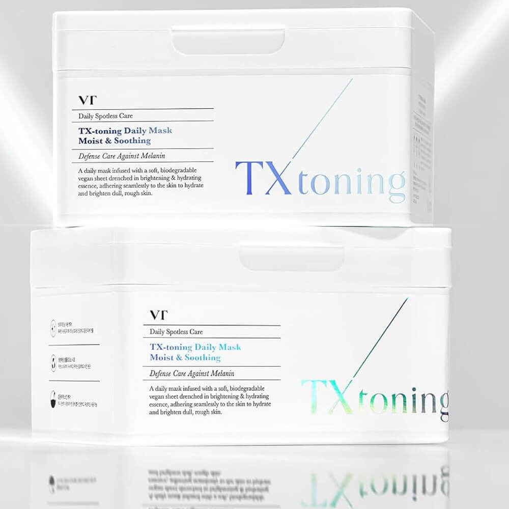 VT Cosmetics TX-Toning Daily Mask Brightening Sheet Mask Set helps combat pigmentation spots, freckles, and post-acne marks. Eliminates dullness, evens out skin tone, restores facial tone and healthy radiance. Blocks melanin synthesis, prevents hyperpigmentation formation, and does not cause photosensitivity.