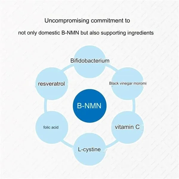 The complex contains ingredients that are lost during aging: 18,000 mg of NMN with the highest purity of 99.9% manufactured according to strict standards, 11 types of vitamins, bird's nest extract, black moromi vinegar, pineapple ceramides, bifidobacteria, calcium, and 3 amino acids.