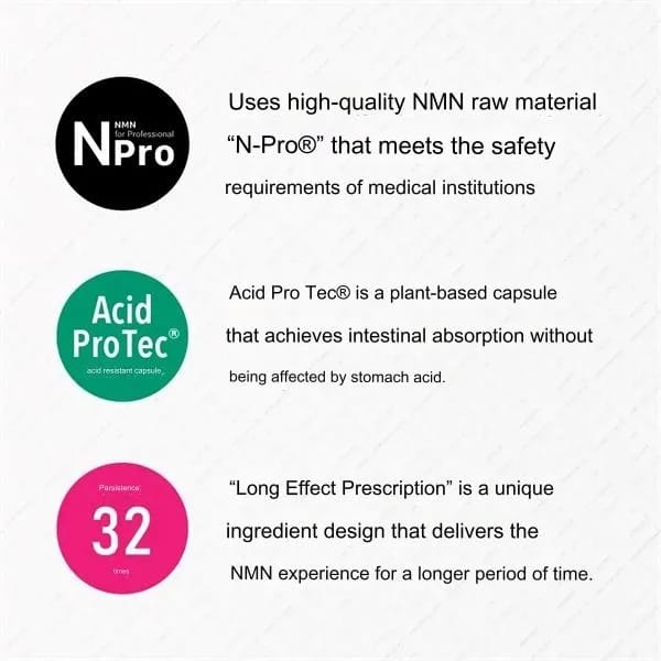 Thanks to the new acid-resistant small capsule technology "Acid ProTec™," NMN easily reaches the intestines and is absorbed 6 times more effectively, providing the equivalent of 18,000 mg. This technology improves the acid resistance of the capsule itself, protects high-quality and valuable NMN, minimizes contact with gastric acid through miniaturization, and ensures delivery to the intestines.